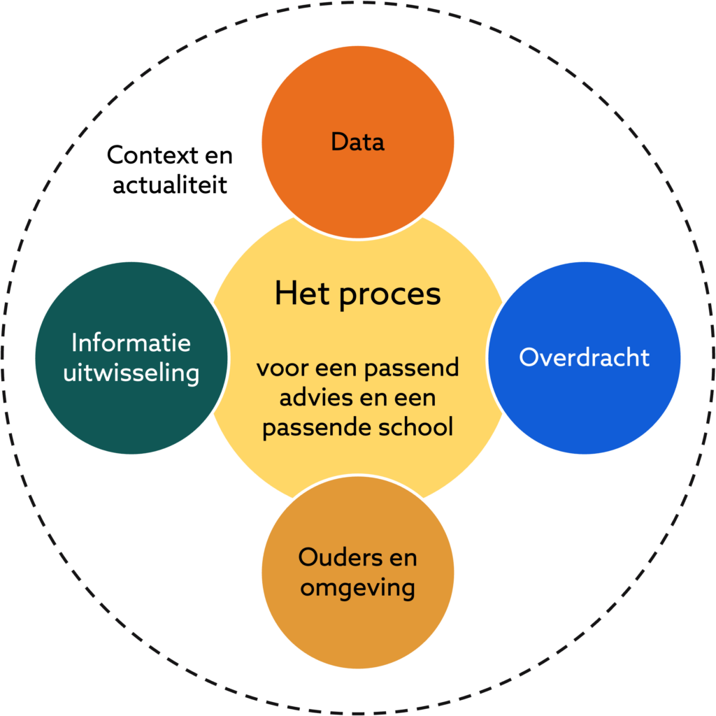In dit model definieerden we vier thema’s die belangrijk zijn voor een passend advies en een passende school: data, overdracht, ouders en omgeving en informatie uitwisseling.